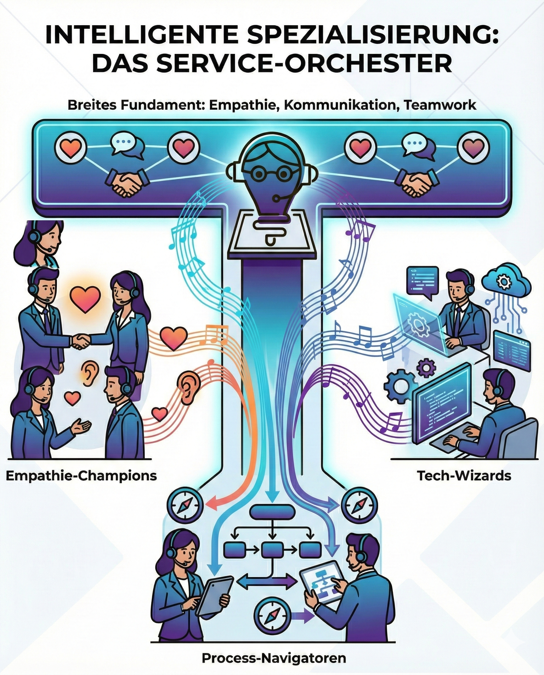 Hier kommt die wahre Zukunftskompetenz ins Spiel: die Fähigkeit, zu erkennen, wann man nicht der Richtige für die Aufgabe ist. Klingt banal? Ist es nicht! In der Praxis erleben wir täglich, wie Agents aus falschem Ehrgeiz oder Systemzwängen an Problemen festhalten, die sie nicht lösen können. Was passiert, wenn Sie morgen eine Kultur etablieren, in der das schnelle Weiterleiten an Spezialisten als Kompetenz und nicht als Schwäche gilt? Die neue Generation von Service-Profis muss vor allem eines beherrschen: die intelligente Orchestrierung von Ressourcen. Sie müssen wissen, wann der Bot übernimmt, wann der Spezialist ran muss und wann sie selbst der perfekte Match sind. Diese Meta-Kompetenz wird wichtiger als jedes Fachwissen.